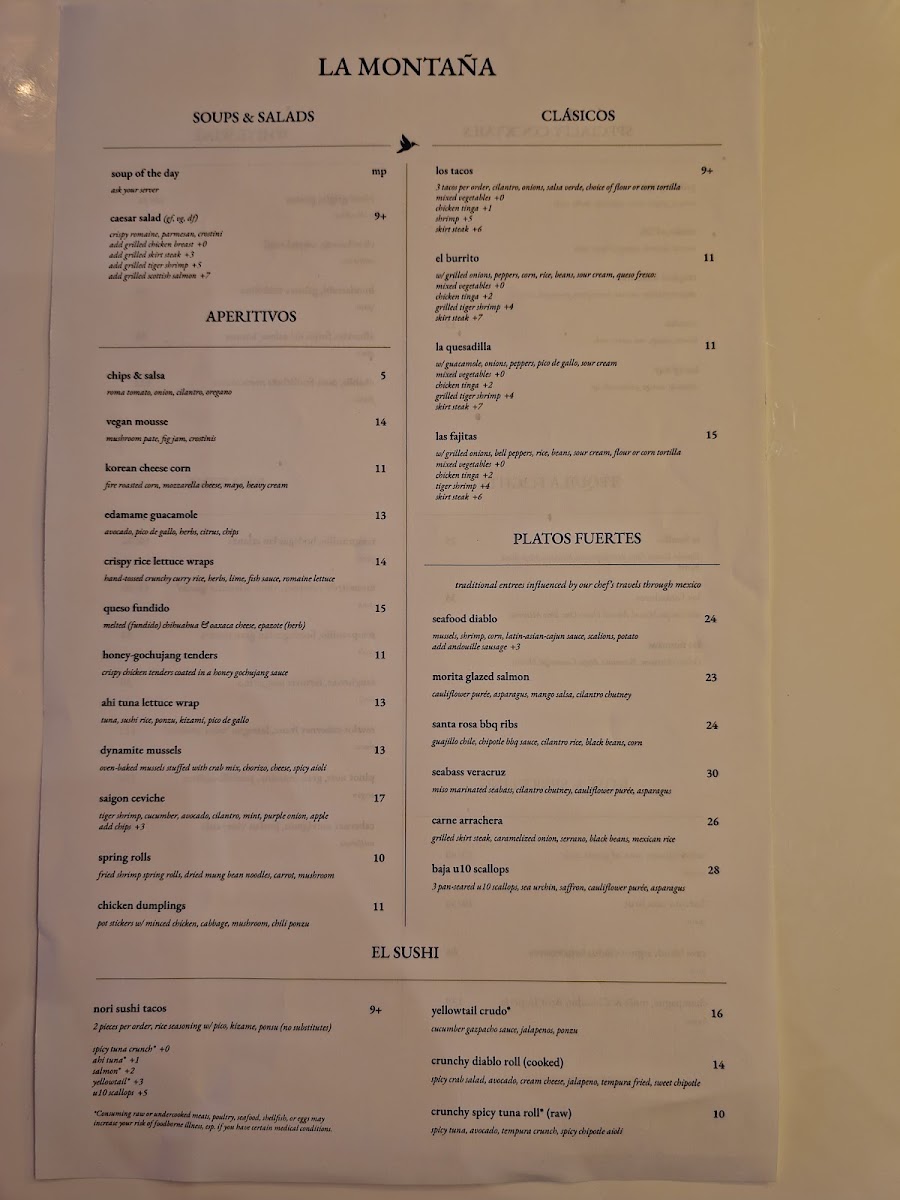 Highlighted dishes include the Tamarind BBQ Ribs, renowned for their perfect balance of savory and sweet, and the Chili Garlic Lo Mein, which offers a unique twist that elevates traditional lo mein. Customers rave about the impossibly fresh sushi, a standout that sets La Montaña apart from typical sushi spots.